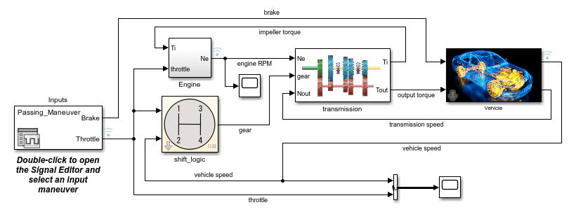 InputsSignal Editor block selects theCoasting,Gradual_Acceleration,Hard_braking, orPassing_Maneuverdriving scenarios. Based on the scenario, the block outputs different brake and throttle data to the model.The