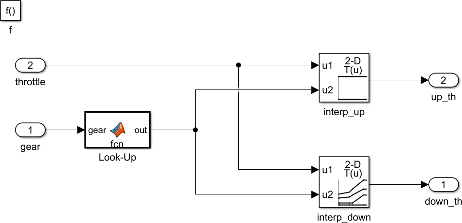 On each step, the selection_state state calls the calc_th Simulink function to calculate new upshifting and downshifting thresholds in response to changes in the gear and throttle.