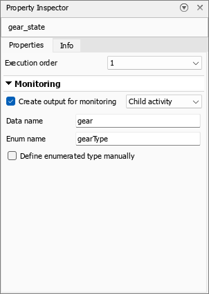 To see the output data settings for gear_state, select the state. In the Modeling tab, click Property Inspector. In this example, Create output for monitoring is selected, Data name is gear, and Enum name is gearType. These settings create an enumerated output data named gear that uses the names of the child states as values. The enumeration has the type gearType.