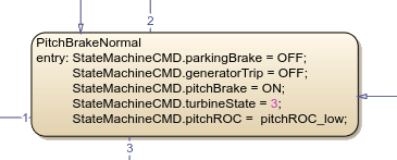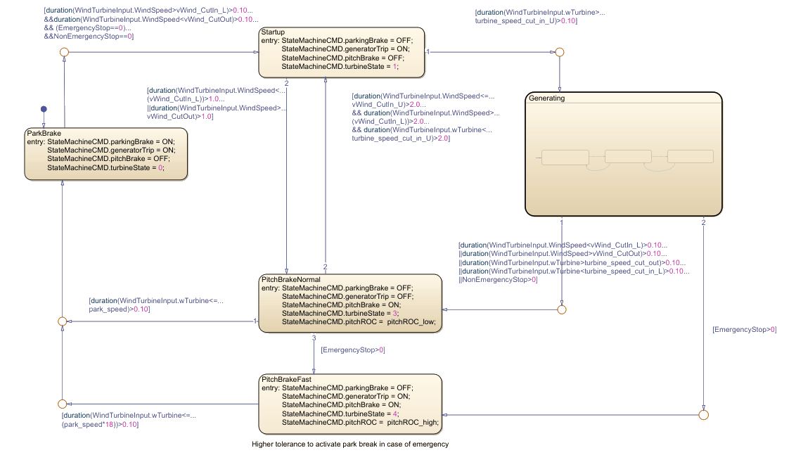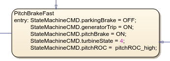The PitchBrakeFast state represents an emergency response mode that rapidly decelerates the turbine blades. The chart transitions to this state when the system detects an emergency stop condition, which occurs when the value of the EmergencyStop variable exceeds 0. This data represents signals a critical situation that requires immediate action.
