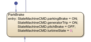 Inside the Turbine State Machine subchart, the default state is ParkBrake. This state forces the wind turbine to remain immobile when not in operation.