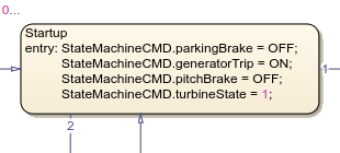 When the wind speed from the turbine is greater than the lower windspeed threshold, cutin_L, and less than the upper wind speed threshold, cutout, for over 0.10 seconds, and all stops are clear, the chart transitions to the Startup state.