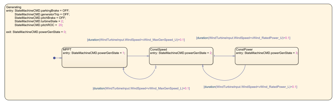When the wind speed is greater than the maximum speed rating for the wind turbine, vWind_MaxGenSpeed_U, the chart transitions to the ConstSpeed state.