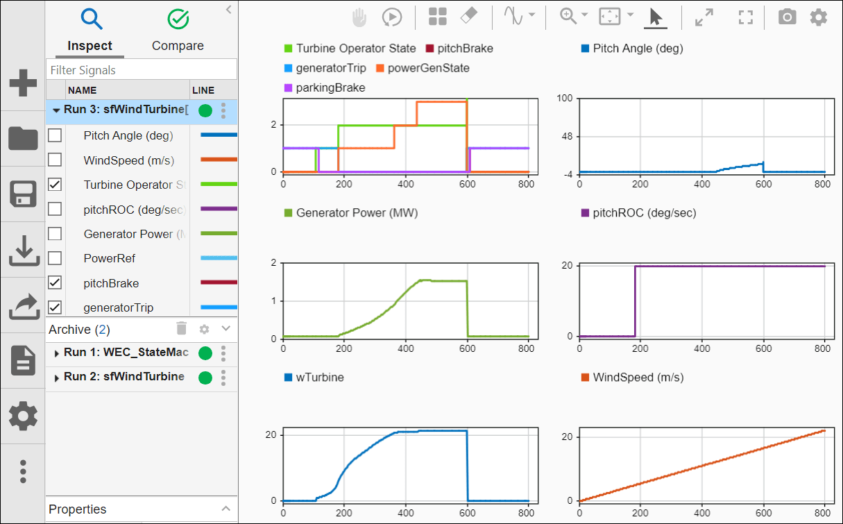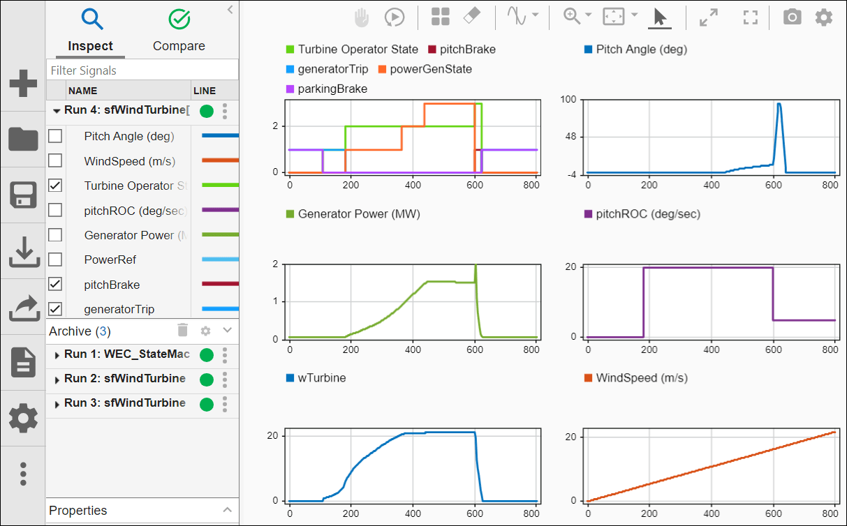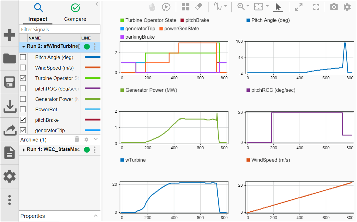The top left graph shows how the Generating state changes operating mode through the simulation, and how the operating mode corresponds to the settings for pitchBrake, generatorTrip, and parkingBrake.