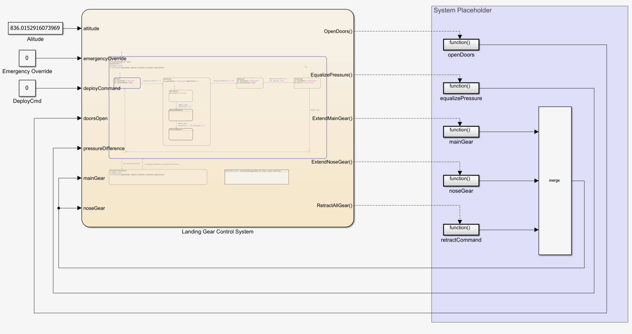 This example shows how to implement mode-based execution and event-driven scheduling in a hydraulic landing gear control system by using Stateflow® to coordinate multiple Simulink® subsystems. Hydraulic landing gear systems require mode-based scheduling to coordinate operations at different flight phases and event-driven control to respond to sensor feedback and safety conditions.