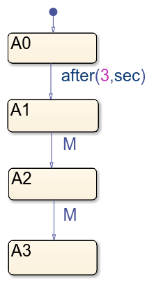 DataReceiver チャートは、タイム ステップごとに 1 回ずつ実行されます。シミュレーションの開始時は、ステート A0 がアクティブです。時間 t=3 で、A0 から A1 への遷移が発生します。時間 t=4 で、チャートは M が 1 に等しいかどうかをテストします。この条件は満たされているため、チャートは A1 から A2 に遷移します。時間 t=5 で、M は引き続き 1 に等しいため、チャートは A2 から A3 に遷移します。スコープ上で、DataReceiver のステートが 3 回変化するのがわかります。