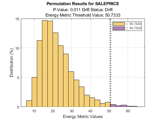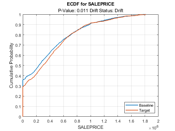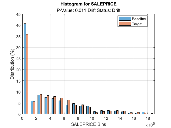 DDiagnostics = detectdrift(baseline(1:1500,:),target(1:1500,:), ... VariableNames=["BOROUGH","BUILDINGCLASSCATEGORY","LANDSQUAREFEET","GROSSSQUAREFEET","SALEPRICE"], ... CategoricalVariables=["BOROUGH","BUILDINGCLASSCATEGORY"], ... Metrics=["Hellinger","Hellinger","ad","ks","energy"])
