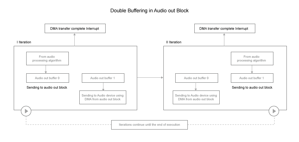 In the second iteration, when the processed audio signal is sent out to the audio device from Audio out buffer0, the Audio out buffer1 is filled with the audio data from the audio processing algorithm.