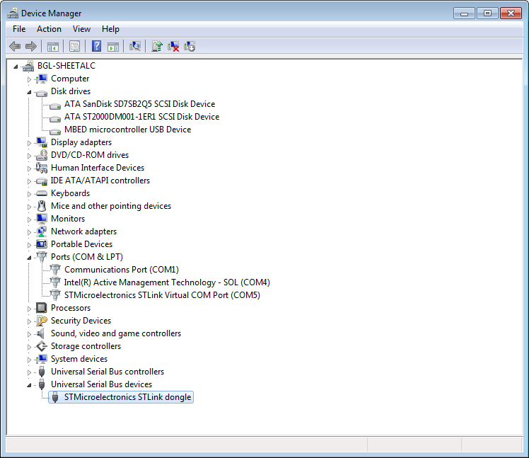 3. After the driver is detected, you see the STMicroelectronics STLink dongle under the Universal Serial Bus devices as shown.