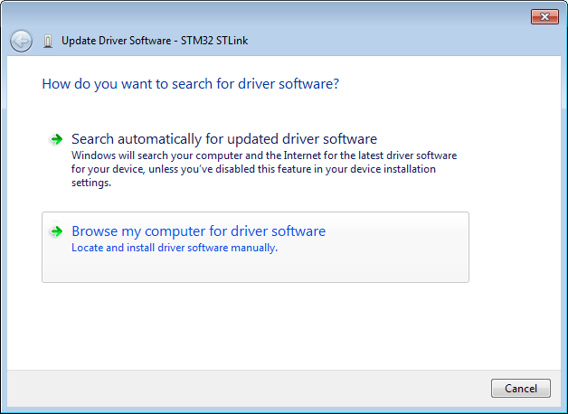 • Right-click Device Manager > Other Devices > ST-Link Debug and then click Update Driver Software. Select the option Browse my computer for driver software. In the Browse window, specify the path of the folder that you have unzipped, for example, C:\en.stsw-link009.