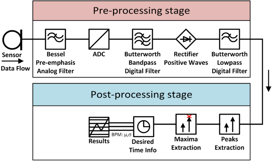 To get the number of beats per minutes (BPM) out of an ECG captured on a patient, a one minute measurement can be done and the high frequency peaks can be manually counted. To speed it up and still have an accurate result, a 30 second measurement can be realized. The sum of the counted peaks is then multiplied by two to get the final BPM value. The goal of the application software is to automate the process measuring the BPM. It first filters the ECG signal to separate and extract the high-frequency peaks and then counts the number of peaks and computes the time difference between every pair of consecutive peaks. The signal processing chain represented in the block diagram is based on these steps.
