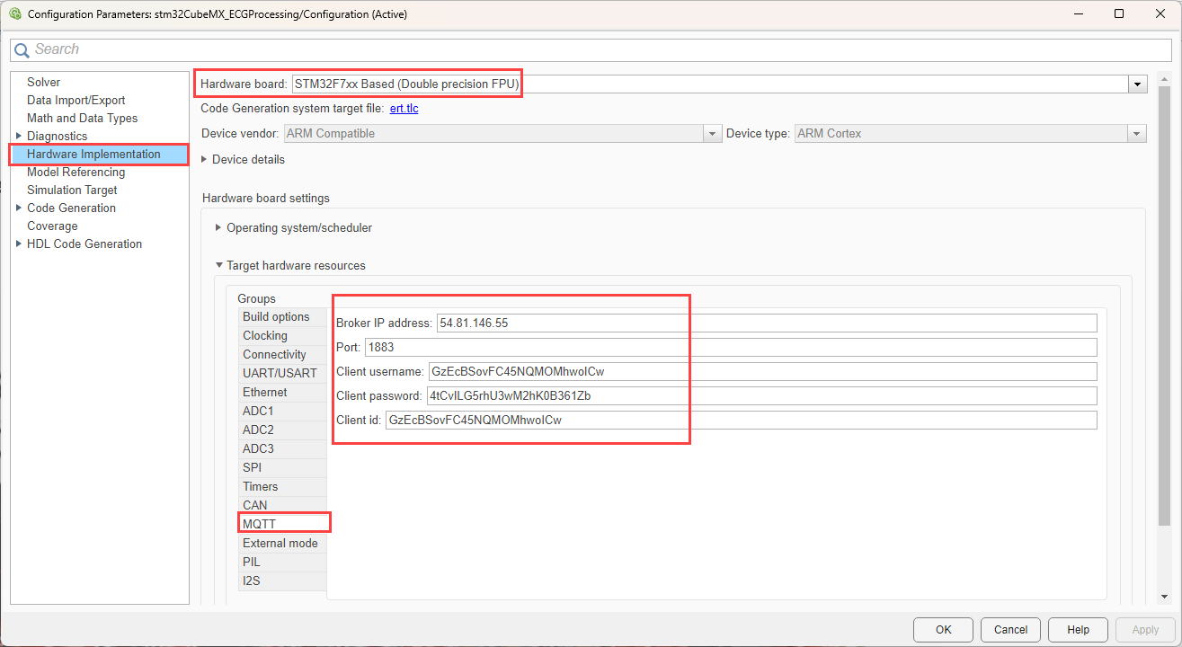 In the STM32, double-click the MQTT Publish and MQTT Subscribe Simulink models, go to the Configuration Parameters > Target hardware resources > MQTT properties and configure these properties.