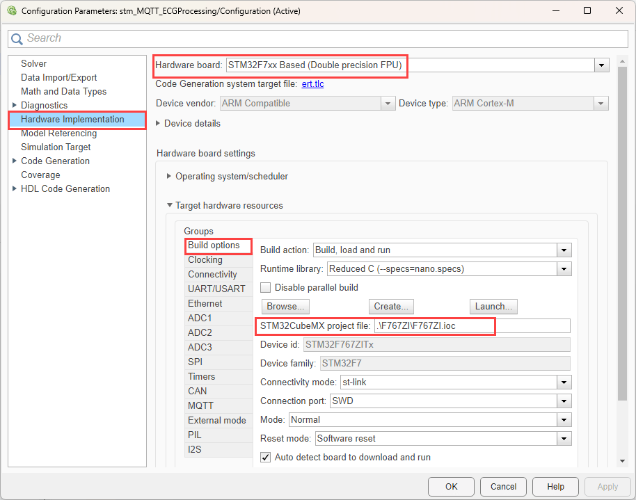 Navigate to Target hardware resources > Build options and verify that the