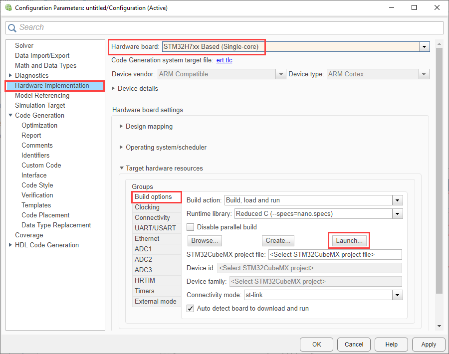 To use Ethernet (TCP, UDP, or MQTT) blocks in models targeting STM32 based boards, you must configure Ethernet options using STM32CubeMX. STM32CubeMX is a configuration tool that enables you to set up peripherals and network features required for these protocols.