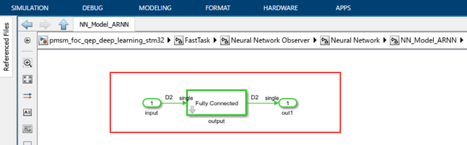 Copy these layers blocks and add them to the subsystem pmsm_foc_qep_deep_learning_stm32/FastTask/FastTask/Neural Network Observer/Neural Network/NN_Model_ARNN (available in the target model pmsm_foc_qep_deep_learning_stm32.slx) as shown in the following figure: