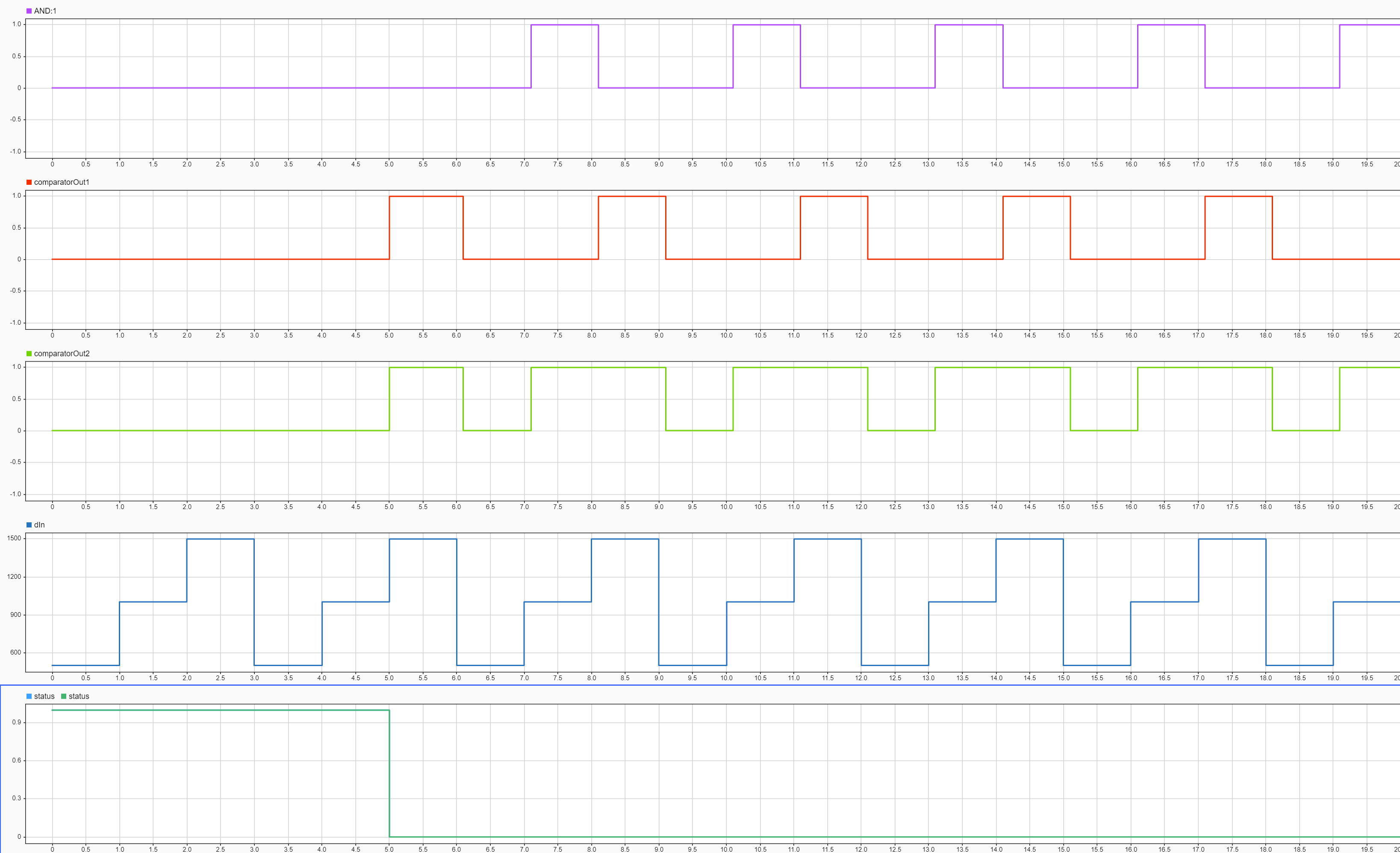 Status (Step Block) Waveform - The status signal remains high (1.0) for the first five seconds of the simulation, then steps down to low (0.0). This transition at the 5-second mark serves as the enable trigger that activates the comparator outputs.