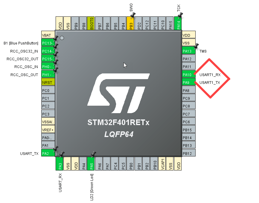 Connect the USART1 PA9 (serial Tx) pin to the USART1 PA10 (serial Rx) pin using a breadboard wire. The model writes the serial data to the PA9 pin. This data is looped back to the PA10 pin on the STM32F401RE board.