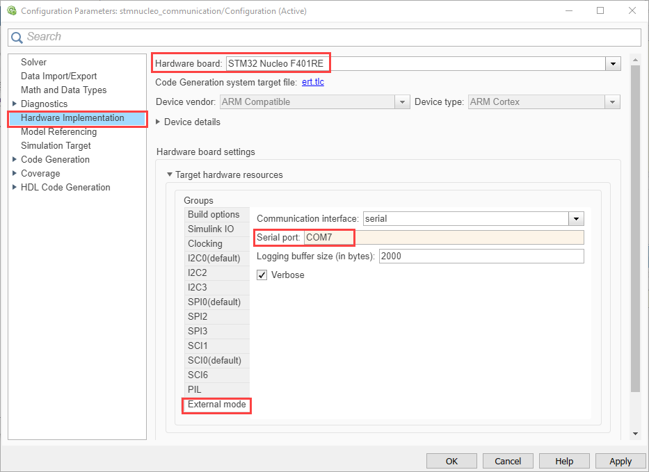 2. Navigate to Hardware Implementation > Target Hardware Resources > External Mode > COM Port and enter the COM port of the serial interface on Windows®.