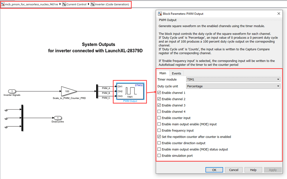 You can use the mcb_pmsm_foc_sensorless_nucleo_f401re or mcb_pmsm_foc_sensorless_nucleo_g474re model with the X-NUCLEO-IHM07M1 expansion board for both simulation and code generation. You can also use the open_system command to open the Simulink® models. For example, use this command for a STM32 Processor based Boards: