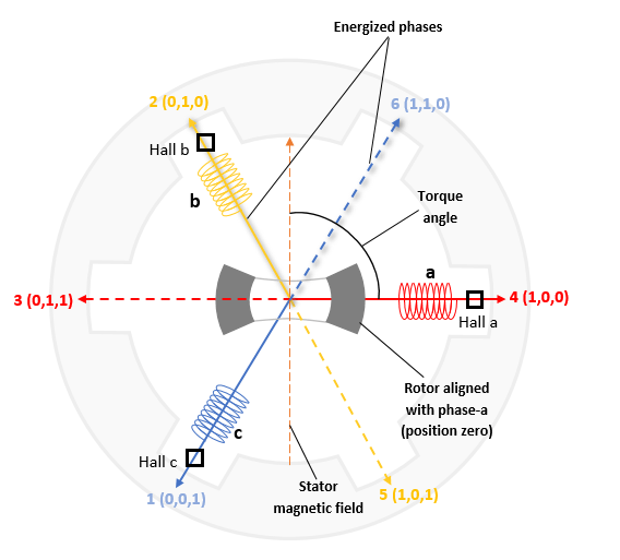 A Hall effect sensor varies its output voltage based on the strength of the applied magnetic field. In the standard configuration, a brushless DC (BLDC) motor consists of three Hall sensors located 120 electrical degrees apart. This arrangement provides six valid combinations of binary states: 001, 010, 011, 100, 101, and 110. The sensor outputs the rotor's angular position in 60-degree multiples, which the controller uses to determine the rotor's current 60-degree sector.