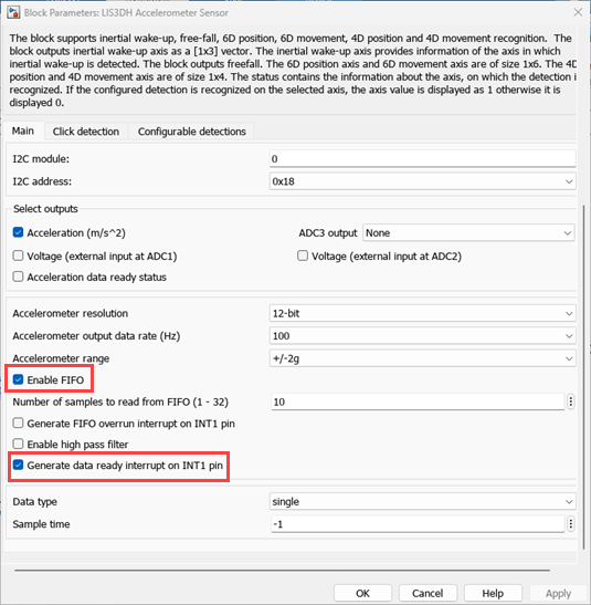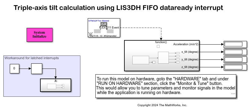 This example shows how to use the FIFO data ready interrupt of LIS3DH linear accelerometer connected to a STMicroelectronics® STM32 processor based board to sense the tilt of the sensor. This dection uses a downstream function-call subsystem that reads acceleration values from FIFO buffer sensor.