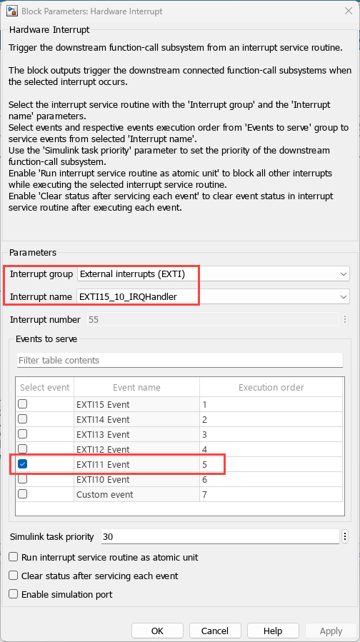 1. In the Simulink® model, open the External Interrupt block, and ensure that the value of Pin number parameter is set to PE11, which is same as the STMicroelectronics STM32 processor based board pin that is connected to INT1 pin on LIS3DH sensor. If required, you can change the pin. For example, connect INT1 to another pin that supports External Interrupt on the STMicroelectronics STM32 processor based board.