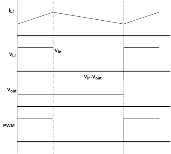 At the beginning of the switching period, the PWM of the bottom switch (Q1) is set HIGH and the top switch (Q2) is set LOW. This turns on MOSFET-Q1 and turns off MOSFET Q2. With the Q1 switch conducting, the current through the inductor L1 begins increasing linearly. At the end of the low-side duty cycle, the switch Q1 is turns off.