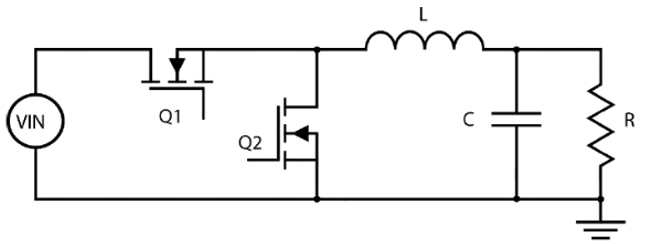 The B-G474E-DPOW1 Discovery kit contains a synchronous buck converter power stage. A simplified schematic of the power stage for a synchronous buck converter is shown here.