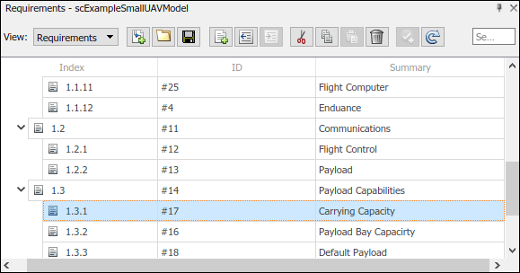 アーキテクチャ モデル内のコンポーネントは、scExampleSmallUAVModel.slreqx で定義されるシステム要件にリンクします。Requirements Manager (Requirements Toolbox)を開きます。モデル ペインの右下隅で [パースペクティブ ビューを表示します] をクリックします。次に、[要件] をクリックします。