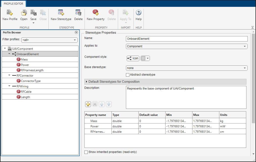 ステレオタイプはプロファイルを使用して XML ファイルで定義されます。プロファイル UAVComponent.xml がこのモデルに付加されています。プロファイル エディターを使用してプロファイルを編集します。[モデル化] タブで、[プロファイル エディター] をクリックします。