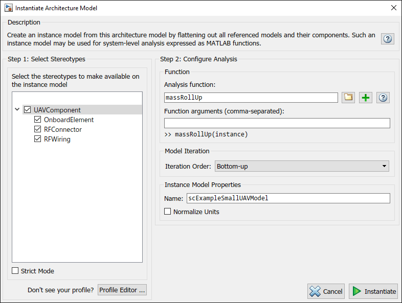 Strict Mode のチェックを外して、すべてのコンポーネントで Mass プロパティがインスタンス化できるようにし、合計質量の計算を容易にします。[インスタンス化] をクリックして解析を生成します。