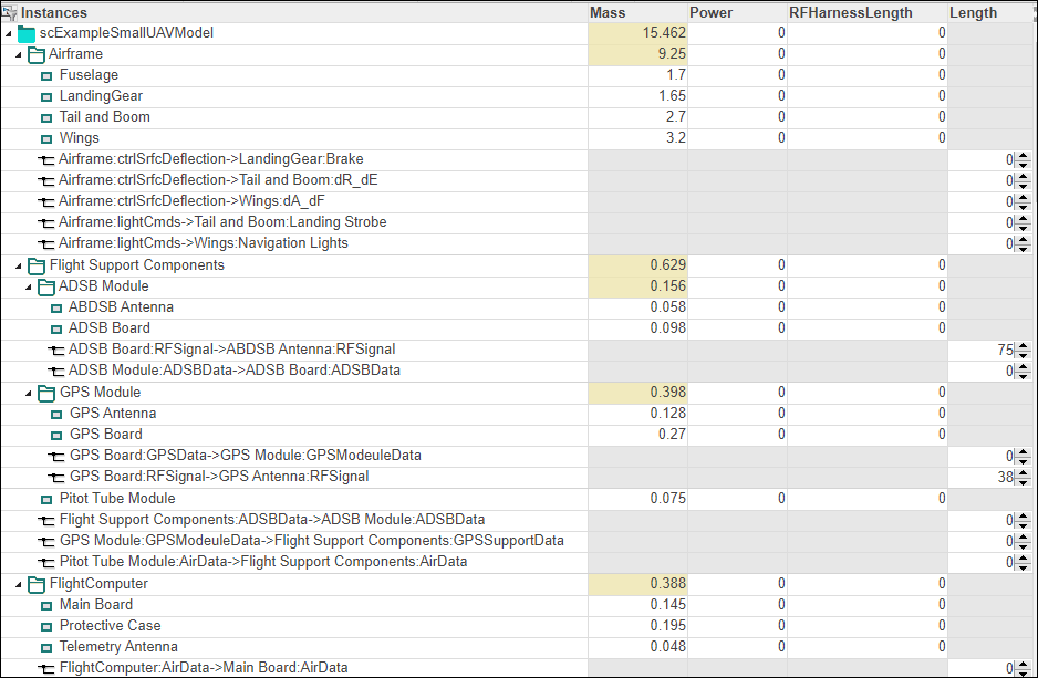 Analysis Viewer画面で [解析] をクリックします。この解析関数は、各コンポーネントの Mass プロパティをそのサブコンポーネントの Mass プロパティの合計として割り当てて、モデル要素をボトムアップで反復します。システム全体の重量は最上位コンポーネント scExampleSmallUAVModel の Mass プロパティに割り当てられます。