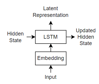 符号化器モデルについて、この例では 1 つの埋め込みとそれに続く 1 つの LSTM 演算で構成されるシンプルなネットワークを使用します。埋め込みとは、categorical トークンを数値ベクトルに変換する手法です。