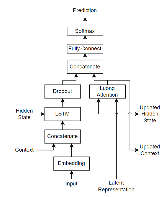 復号化器モデルについて、この例では 1 つの LSTM 演算と 1 つのアテンション メカニズムを含むネットワークを使用します。アテンション メカニズムにより、復号化器が符号化器の出力の特定部分に "注意を払う" ことができます。