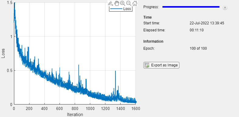 miniBatchSize = 32; numEpochs = 100; learnRate = 0.001;