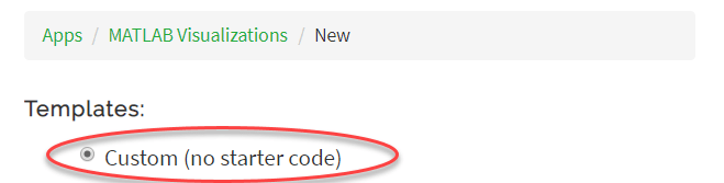 [Apps] > [MATLAB Visualizations] を選択します。次に、新規 を選択し、カスタム (スターター コードなし) を選択して、作成 をクリックします。