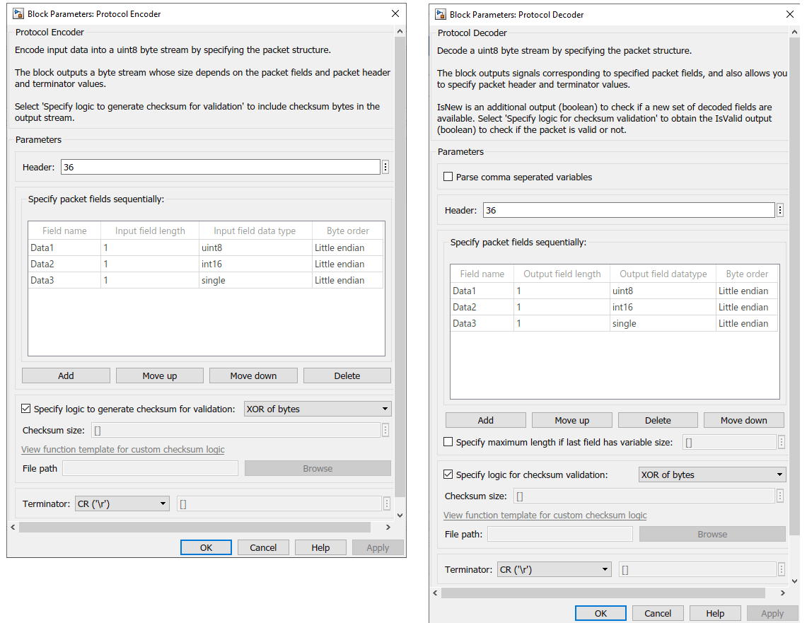 受信側では、バイト ストリームは C28x SCI Receive ブロックを使用して受信され、Protocol Decoder ブロックを使用して個体のフィールドにデコードされます。新しいデータが利用可能であることを示す SCI Receive ブロックのステータス出力は、Protocol Decoder ブロックを含む有効なサブシステムをトリガーするために使用されます。