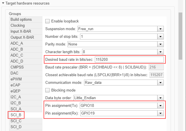 5. ターゲット ハードウェア リソース の下で、SCI_B タブをクリックし、ボー レートやピン割り当てなどのプロパティを構成します。