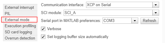 3. ターゲット ハードウェア リソース の下で、外部モード タブをクリックし、通信インターフェイス と SCI モジュールパラメーターとしてそれぞれ XCP on Serial と SCI_A を選択します。C2000 ベース プロセッサが接続されているホスト コンピュータの COM ポートに対応する値を選択します。