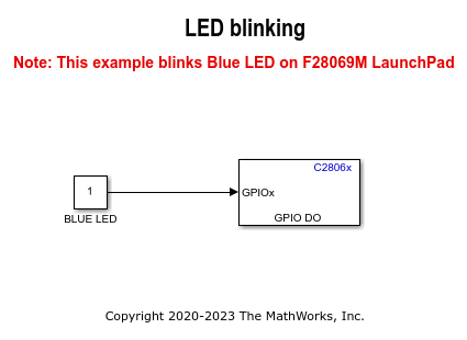 このタスクでは、TI Piccolo F28069M LaunchPad (シングル コア) で実行するために、オンボードLED を点滅させる簡単なモデルを作成して構成します。