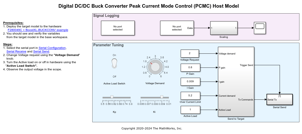 この例では、 Texas Instruments ™ C2000™ Microcontroller Blockset のピーク電流モード制御 (PCMC) を使用して、Comparator Subsystem (CMPSS) を使用して降圧コンバータの出力電圧 (BOOSTXL-BUCKCONV) を調整する方法を示します。この例では以下を行うことができます。