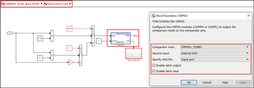 コンパレータ出力に基づいてePWM を切り替えるには、モデルの Initialize サブシステムで次の構成を行います。