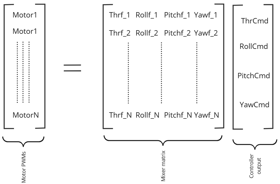 In this equation, Motor1 to MotorN represent the motor actuator outputs (PWM signals sent to each motor). ThrCmd, RollCmd, PitchCmd, and YawCmd are the throttle, roll, pitch, and yaw outputs, respectively, from the controller. The mixer matrix values should be normalized to the range -1 to +1 to ensure consistent scaling across all motor commands.