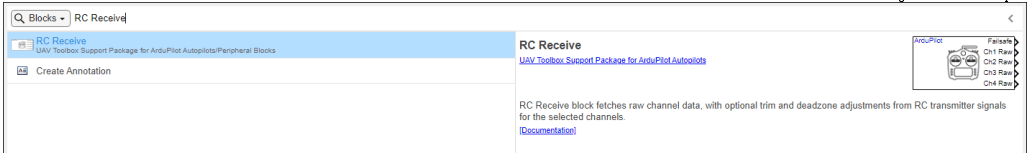 Double-click anywhere in the model canvas. In the quick insert menu that appears, enter RC Receive. A list of blocks appears. Verify that the RC Receive block from the UAV Toolbox Support Package for ArduPilot Autopilots library is selected. Check the library name listed under the block name and the block description in the pane to the right of the search results.