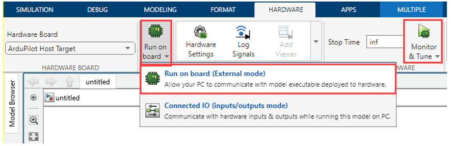 The example model is already configured for the ArduPilot Host target, which enables Software-In-the-Loop (SITL) simulation for ArduPilot. You can now run the model directly in Monitor & Tune mode to test and tune your algorithms in real time.
