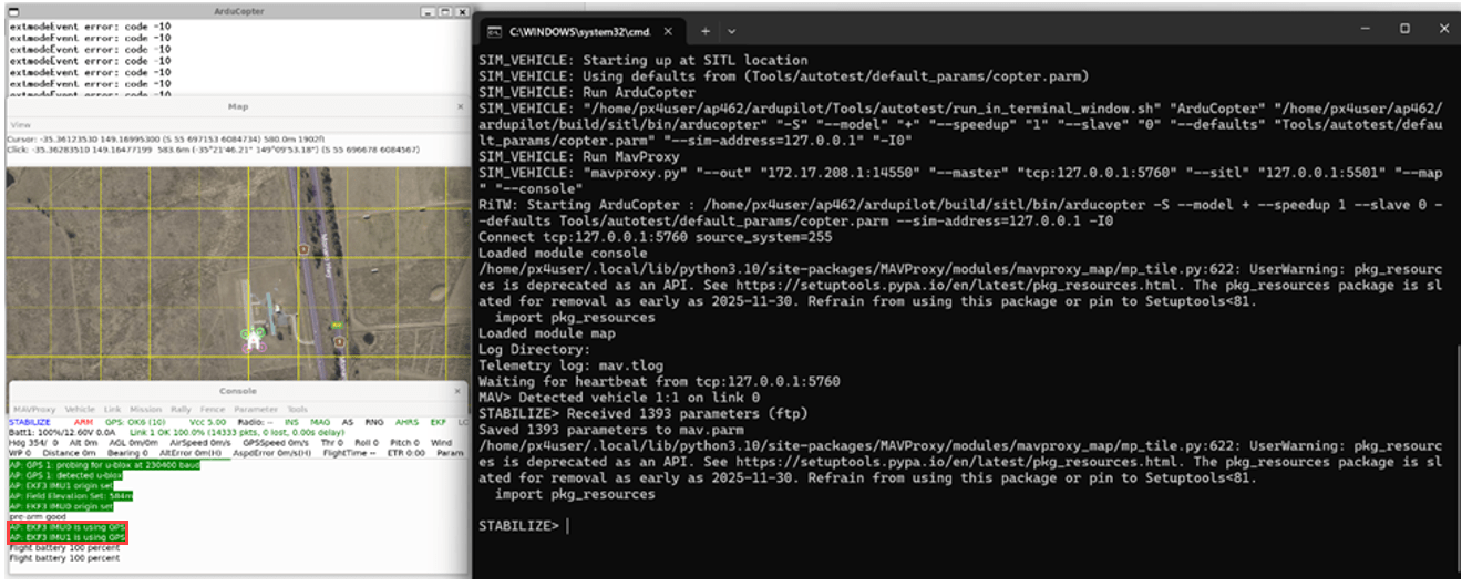 Wait until Simulink finishes generating the code and the ArduPilot build process is complete. Once the build is finished, the ArduPilot SITL (Software-In-The-Loop) window will automatically open along with MAVProxy terminals. Simulink will then establish a connection with SITL, and you will see the simulation progress bar advancing in Simulink.