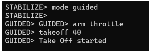 • Use the takeoff command to ascend the drone to your desired altitude (for example, 40 meters as shown in previous commands).