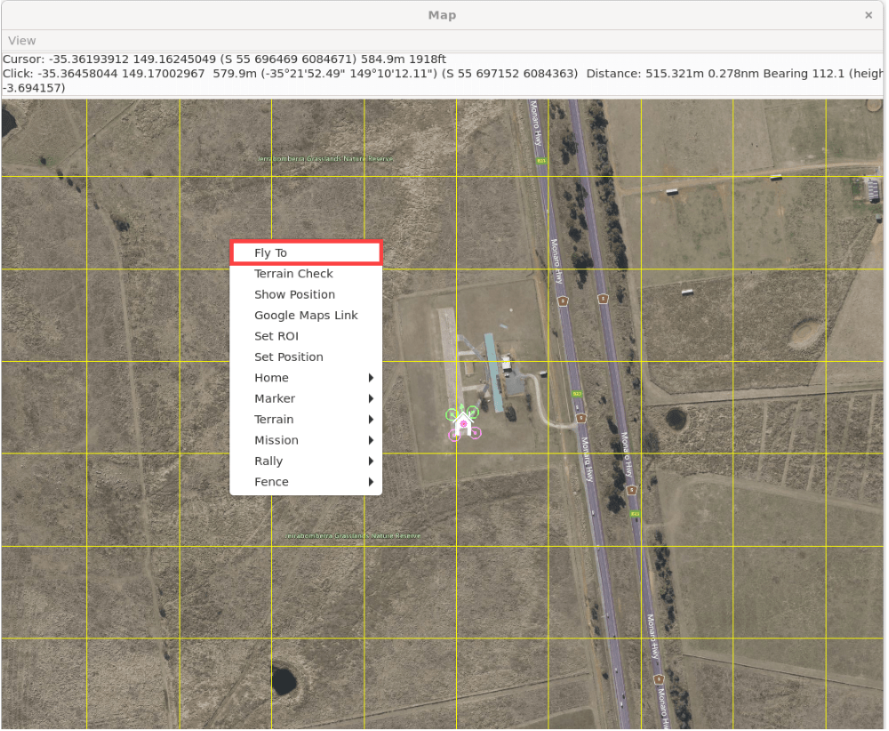 • Right-click anywhere on the map in MAVProxy and select the option to fly the drone to that location.