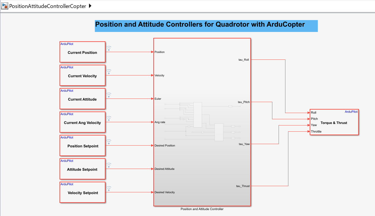 This example shows how to use the UAV Toolbox Support Package for ArduPilot® Autopilots to design position and attitude controllers for ArduCopter in Simulink®. This example is designed to run with the ArduPilot Host Target, allowing you to perform Software-in-the-Loop (SITL) simulation.