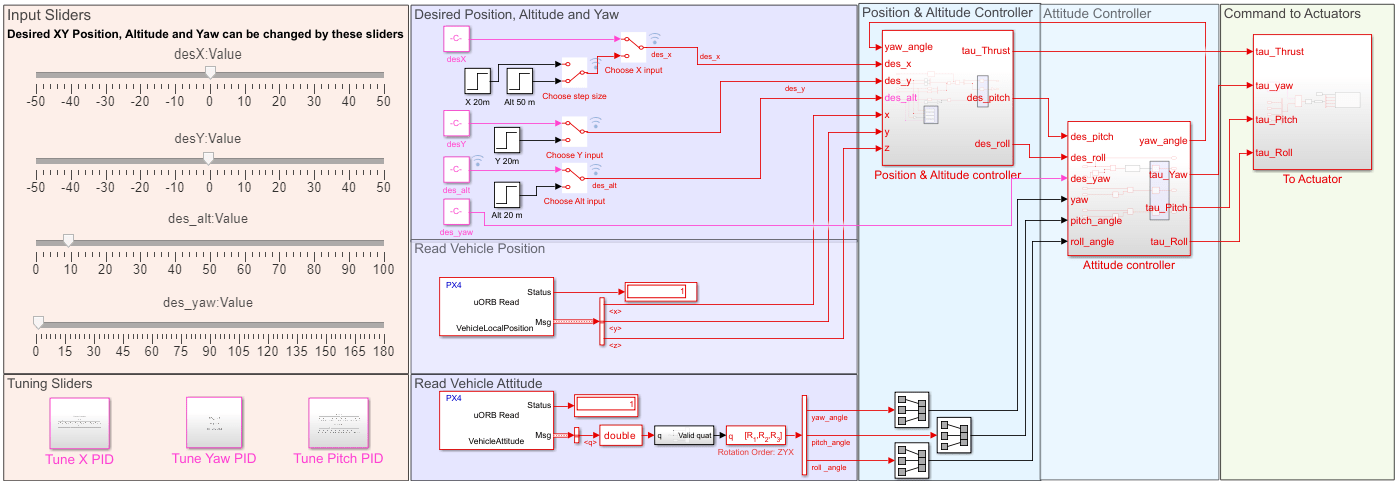 The Desired Position, Altitude and Yaw section outputs these signals as inputs for the Position & Altitude controller and Attitude controller subsystems: